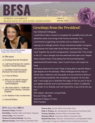 The mission of the Black Faculty and Staff Association (BFSA) is to support Black faculty, students, and staff at Furman University (FU). The organization will accomplish this mission by serving as an advocate and support group for the concerns of Black faculty, staff, and students. Additionally, the BFSA seeks to enhance the recruitment, retention, and advancement of Black faculty, staff, and students as we seek to pursue the vision and mission of Furman University (FU).